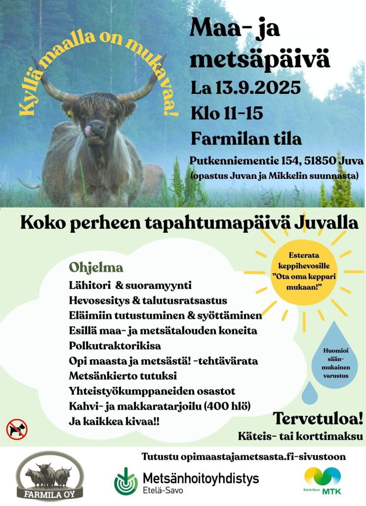 Metsänhoitoyhdistys Etelä-Savo, Farmila Oy, MTK Juva ja MTK Etelä-Savo järjestävät koko perheen iloisen tapahtumapäivän Farmilan tilalla Juvalla, Putkenniementie 154, 51850 Juva.